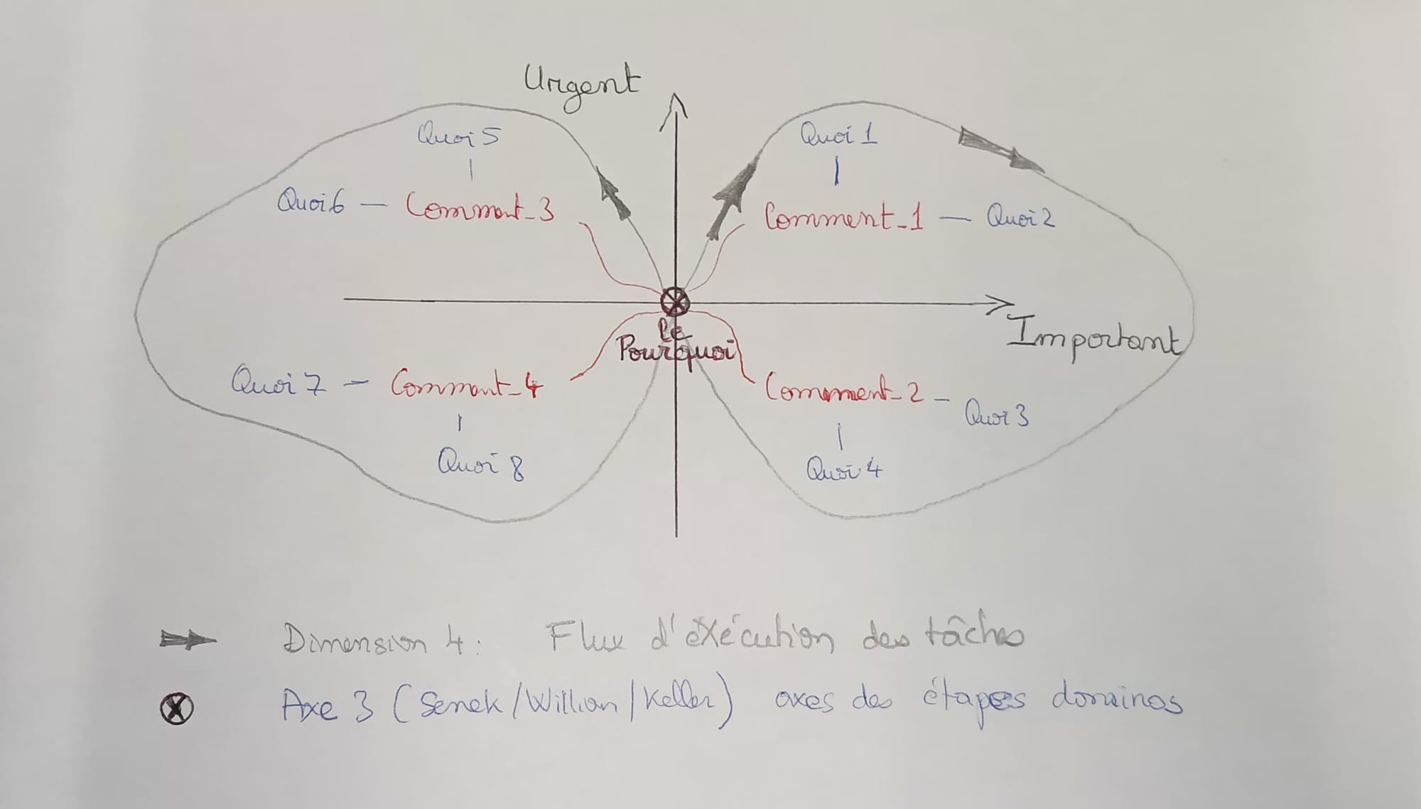 S'inspirer de nos prédécesseurs reste une bonne piste. C'est ce que je fis en étudiant l'oeuvre de Simon Sinek "Start with why", celui de Keller Williams "The one thing" et le principe de la "Matrice d'Eisenhower". Je me suis inspiré de leurs principes pour élaborer mon propre modèle d'organisation. Ce modèle se présente sous la forme d'une carte en 4 dimensions :